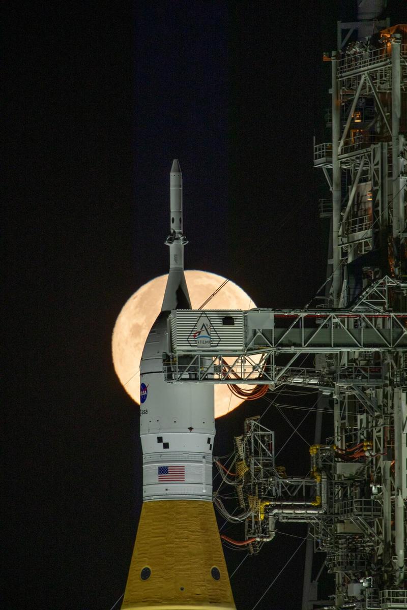 Луна поднимается за ракетой НАСА Artemis II SLS (Space Launch System) и космическим кораблем Orion на мобильном старт...