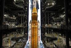 Видно, как ракета NASA Space Launch System (SLS) и космический аппарат Orion, закрепленные на мобильной пусковой уста...
